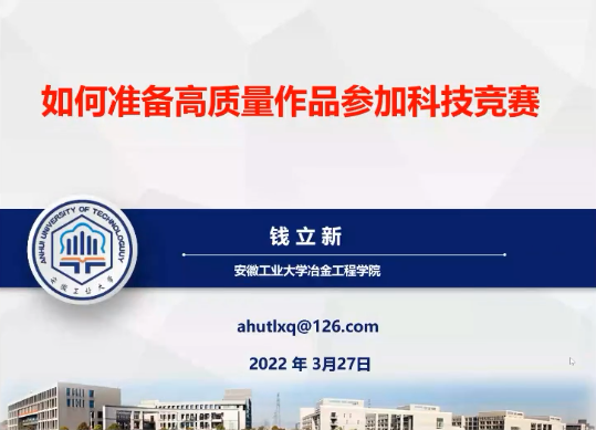 钱立新以“如何准备高质量作品参加科技竞赛”为题,分享了自己参加“挑战杯”获得国赛一等奖的经历和收获,重点从选题、团队、成果等多个方面讲解了如何准备一份高质量的参赛作品。