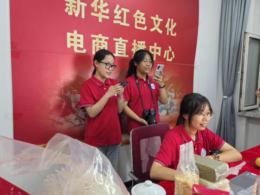 图为队员通过网络平台宣传新华村红色文化及农副产品