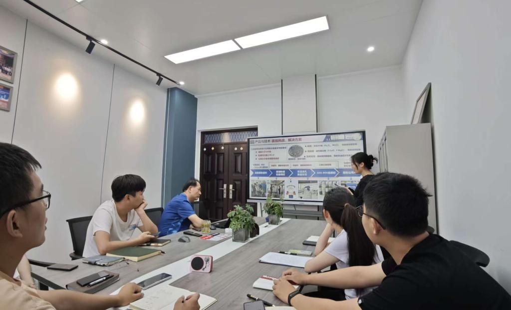 图为团队成员在污泥固废处理中心与技术人员开展交流,了解生产流程