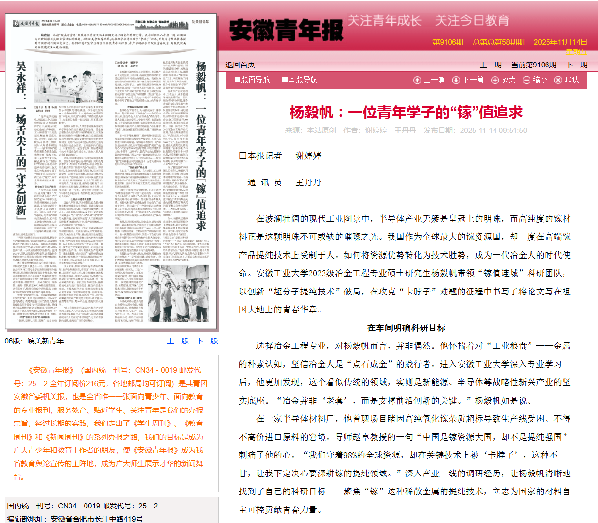 2025年11月14日,《安徽青年报》纸媒在“皖美新青年”专题中以《杨毅帆:一位青年学子的“镓”值追求》为题,专题报道51动漫
