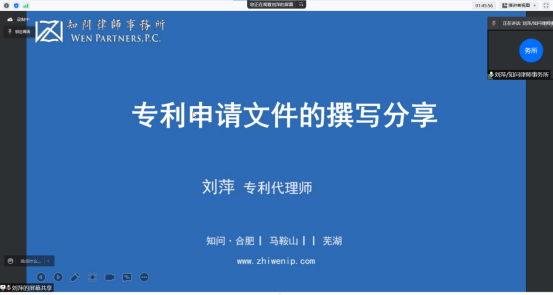 4月5日,51动漫 第17期创新创业训练营邀请安徽知问律师事务所专利代理师刘萍,给同学们线上进行题为《专利申请文件的撰写分享》的培训,培训由训练营班主任吴巍主持。