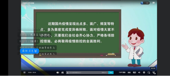 活动中放映了防疫抗疫相关视频,提醒同学们关注当下疫情形势,积极配合学校防疫工作安排,做好自我防护,戴口罩、勤洗手、注意个人卫生。
