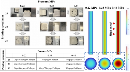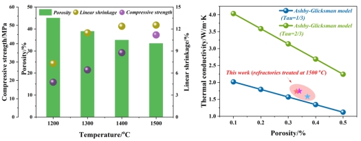 此外,团队利用增材制造技术制备具有低导热、高强及耐腐蚀的刚玉-莫来石质耐火材料,通过优化打印浆料流变特性(粘度、触变性),调控打印参数(压力、打印速率),改善坯体的打印结构精度(图3)。在此基础上,研究了不同煅烧温度(1200~1500℃)对刚玉-莫来石质耐火材料物相组成、微观形貌、抗侵蚀性及物理性能的影响。并采用Ashby-Glicksman(开气孔/闭气孔)模型对所制备的耐火材料的导热系数进行计算和预测(图4)。相关工作发表在《Journal of the European Ceramic Society》上,材料科学与工程学院李赛赛博士和51动漫